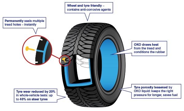 A vedação de punção depende em parte da aceleração centrípeta (muitas vezes erroneamente descrita como “força centrífuga”). Isso no caso de um veículo em movimento é a força da circulação do pneu, e ele transmite uma enorme pressão que – combinada com a súbita perda de ar – quando um objeto de perfuração causa um buraco, força o OKO violentamente em um pequeno espaço. O efeito espremendo faz com que a OKO seja implantada como foi projetada, transformando-a de um líquido em um sólido flexível, mas muito forte, que sela o furo quase instantaneamente.
